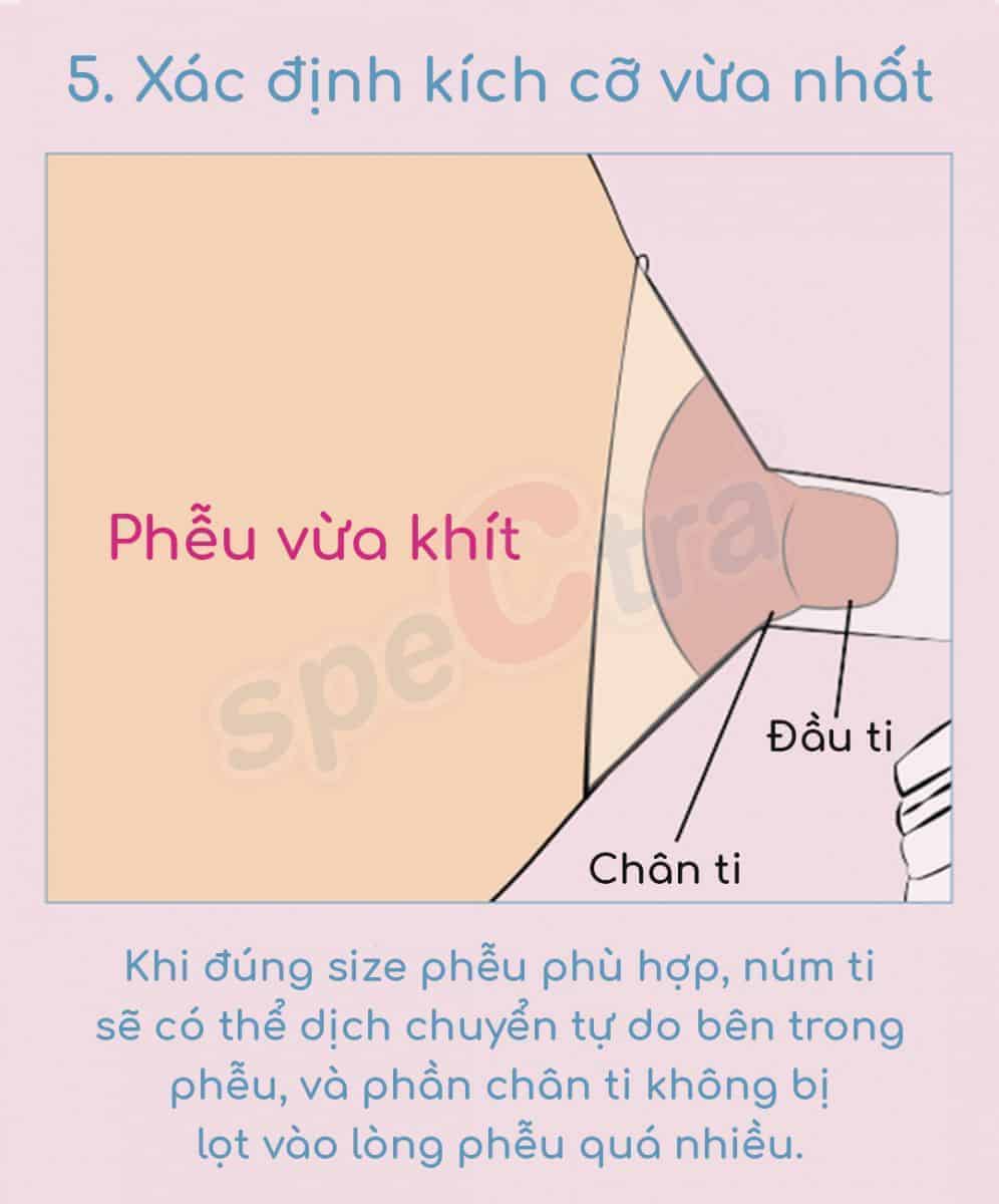 Khi dùng đúng size phễu phù hợp, núm ti sẽ có một khoảng không gian vừa đủ để dịch chuyển tự do bên trong lòng phễu mà không bị chạm vào thành phễu như khi phễu bị chật, hay dư quá nhiều khoảng trống như khi phễu quá rộng, điều này sẽ cho phép chân ti lọt vào lòng phễu một ít.