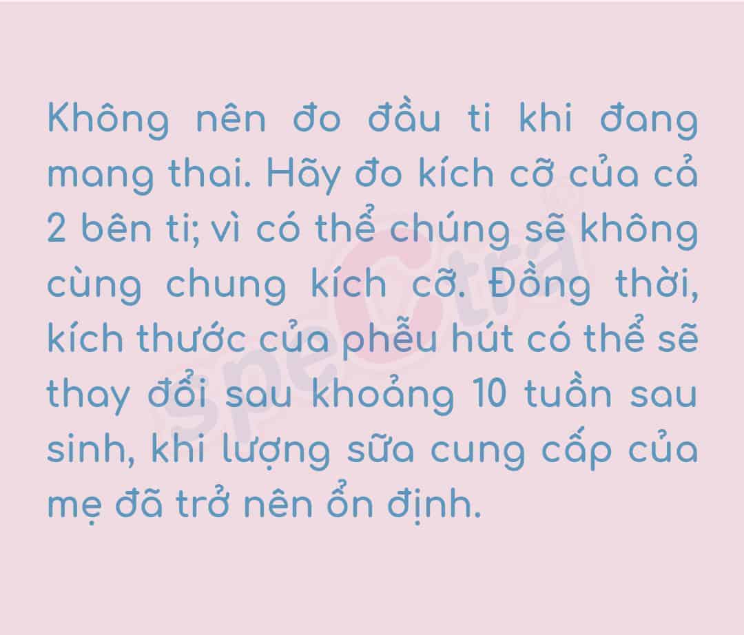 Không nên đo ti khi đang mang thai vì sau khi sinh ti của mẹ sẽ còn nở to hơn. Khi đo, hãy đi kích cỡ của cả hai bên ti, vì có thể chúng sẽ không giống nhau. Đồng thời, vào khoảng 10 tuần sau sinh, khi lượng sữa mẹ cung cấp đã trở nên ổn định, có thể kích thước ti của mẹ sẽ thay đổi.