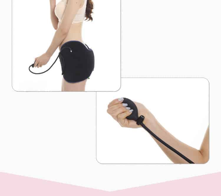 - Khi đảm bảo đai đã được cố định vào cơ thể, chắc chắn, các bạn bắt đầu bóp dụng cụ bóp được gắn trên đai để 2 túi khí hình thoi căng ra và ép vùng xương chậu để định hình lại. Trên dụng cụ bóp có van để điều chỉnh, khi túi khí căng thì có thể xả bớt khí ra để định hình lại nhằm phục hợp với từng người.